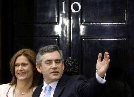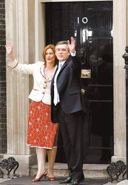 6月27日,英国新任首相布朗与夫人抵达位于伦敦的首相官邸唐宁街10号。英国女王当天正式任命现任工党领袖布朗为首相,并授权他组建新内阁。