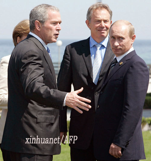 6月8日,美国总统布什(左)、英国首相布莱尔(中)和俄罗斯总统普京在德国海利根达姆合影。继7日向布什提议共同利用俄军在阿塞拜疆的雷达站、取代美国计划中的东欧反导系统后,普京8日就反导系统部署选址再次发表言论说,反导基地可以部署在欧洲南部,如“美国在北约的盟友土耳其”,“甚至不妨部署在伊拉克”。 新华社/法新