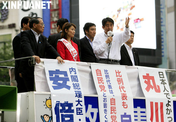 7月12日,日本首相安倍晋三(右二)在阁僚的陪同下乘坐选举车在首都东京的闹市区涩谷街头演讲,为自民党参院选举造势。当日,为期17天的日本国会参议院竞选活动正式拉开序幕,各政党领导人和候选人开始全面开展竞选活动,争取选票。 新华社记者任正来摄