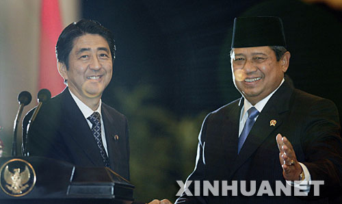 8月20日,在印度尼西亚首都雅加达总统府,印尼总统苏西洛(右)会见日本首相安倍晋三。 新华社记者张军摄