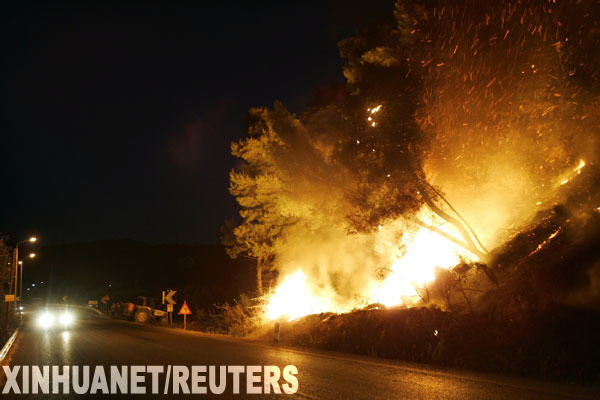 8月25日,在希腊伯罗奔尼撒半岛上的一个村庄附近,一辆汽车从燃起大火的山坡旁驶过。希腊总理卡拉曼利斯25日晚发表电视讲话,称火灾给国家带来了严峻的挑战,并宣布全国进入紧急状态。8月24日以来,希腊境内发生数百起火灾,目前已造成46人死亡,其中包括4名消防队员。新华社/路透