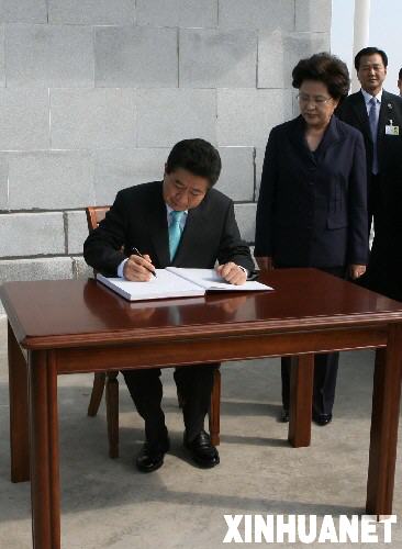 10月4日,韩国总统卢武铉(左)参观位于朝鲜南浦市郊区的西海水闸后在留言簿上写下“人民是伟大的”。 新华社记者夏宇摄