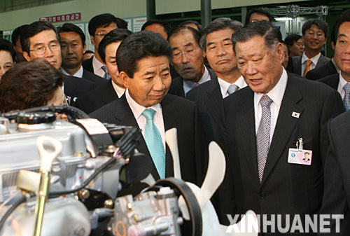 10月4日,韩国总统卢武铉(前排中)参观朝鲜南浦市由朝韩双方共同投资的和平汽车厂的装配车间。 新华社记者夏宇摄