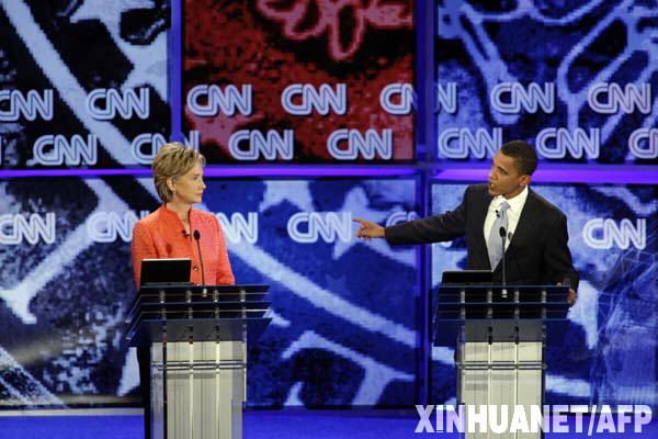 7月23日,在美国加利福尼亚州的查尔斯顿,纽约州联邦参议员希拉里·克林顿(左)与伊利诺伊州联邦参议员贝拉克·奥巴马参加竞选民主党总统候选人的电视辩论。美国媒体23日公布一项民意调查显示,希拉里·克林顿在民主党内的支持率继续领先于包括奥巴马在内的其他民主党总统竞选人。