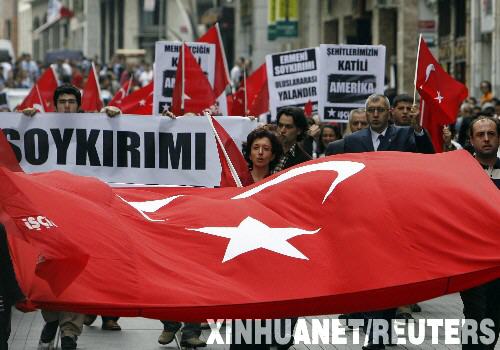 10月11日,示威者在土耳其伊斯坦布尔参加反美游行。土耳其外交部当日发表声明,谴责美国众议院外交事务委员会10日以27票赞成、21票反对的表决结果通过有关把土耳其奥斯曼帝国大批杀害亚美尼亚人认定为“种族屠杀”的议案。