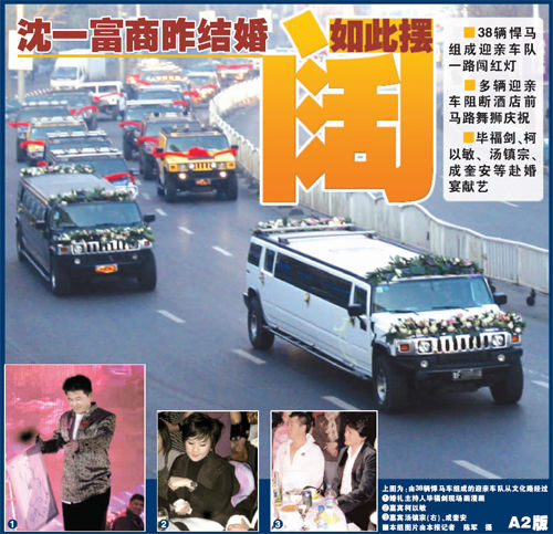 据了解,新郎新娘都是沈阳人,新郎家在沈阳有多家企业,资产上亿。据婚礼车队司机透露,黑白两台加长悍马分别是从浙江和山东的生意朋友处“借”来的,其他悍马也都是从外市甚至外省“借”来的。有两辆停在路边的悍马,贴在号牌上的纸已经脱落,漏出了辽g和辽h字样。