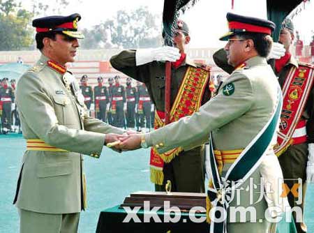 在军职交接仪式上,穆沙拉夫将指挥权杖交给基亚尼。