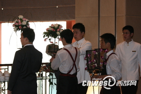 笔者凌晨5时抵达婚宴现场时,工作人员已经在清理现场的垃圾和不用的东西。“这些西伯利亚百合和玫瑰都是昨晚从云南空运过来的,品种非常高贵。”一位搬运工向笔者介绍道,他把精挑细选后剩下的百合与玫瑰正在往外拉。原来他们连夜赶工,目前整个大厅的装饰已经到了收尾阶段。