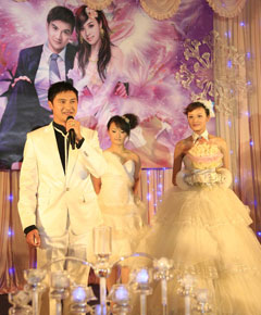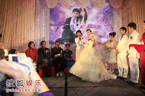 大厅里弥漫着一股沁人心脾的芬芳,笔者远远看到宴会厅中央立着田亮与叶一茜梦幻水晶般的婚照,年轻的田亮穿着黑色西装白衬衣,而妻子叶一茜则身着粉色长裙依偎在他的身边,照片应该是合成的,颇有一丝卡通美少年的味道。