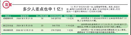 11月27日亿元大奖一出,全国皆呼惊奇。其实,在这之前,曾有几位彩民中得20注、甚至30注双色球二等奖,仅仅因为一个蓝球之差而与1亿元失之交臂。 |