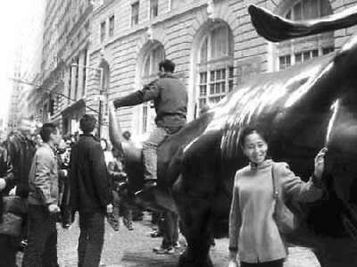 据报载,美国纽约华尔街上有尊青铜公牛塑像,一些中国游客骑牛拍照(见左图),恰巧被北京电视台主持人看到了。事情传开后,有媒体发表报道和评论,认为此行为再次暴露了部分中国游客素质低下的事实。在北美华人网站,很快有网友贴出了各国游客骑铜牛的照片,认为国内媒体小题大做。