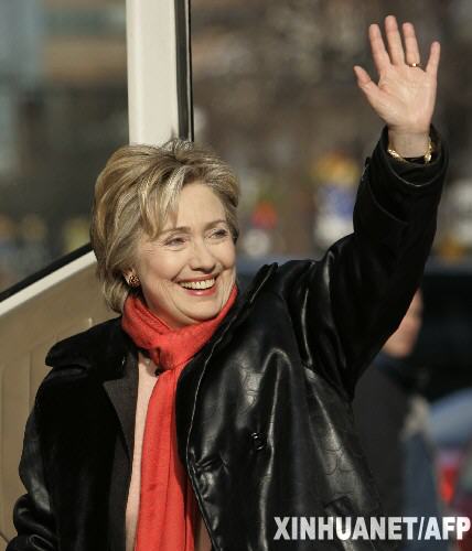 1月4日,在美国新罕布什尔州的曼彻斯特,民主党总统竞选人希拉里·克林顿向支持者挥手。美国总统选举首场党内预选1月3日在艾奥瓦州结束后,民主、共和两党总统竞选人纷纷赶赴新罕布什尔州,为1月8日将在这里举行的直接预选(选民直接投票)造势。新华社/法新
