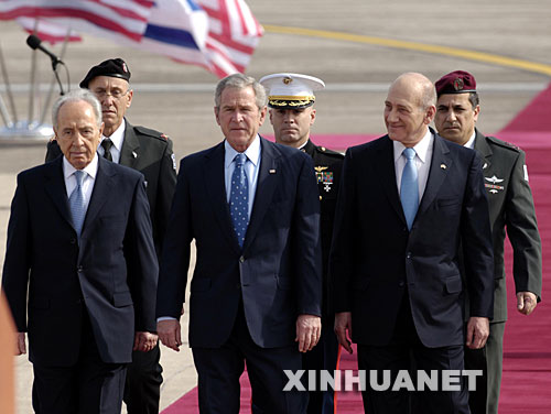 1月9日,美国总统布什(中)在以色列总统佩雷斯(左)和总理奥尔默特的陪同下在特拉维夫检阅仪仗队。美国总统布什当天中午抵达以色列,开始中东之行第一站的访问。