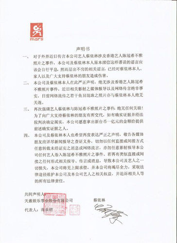 一、对于外界近日传言本公司艺人蔡依林涉及香港艺人陈冠希不雅照片之事件,本公司及蔡依林本人原本深信这样谬误的谣言应该会自行平息,然而层出不穷的相关谣言,已经对蔡依林本人、家人以及广大支持蔡依林的朋友造成伤害。