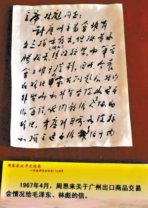 大量的书籍和书信题字原件和复制品,记载着逝去的尘封一幕幕。其中1967年4月周恩来关于广州出口商品交易会情况致毛泽东、林彪的信,是刚从中央档案馆复制出来、首次公开的文物复制珍品。值得一提的是,广交会能够一直坚持下来,与周恩来这一封信有重大关系。
