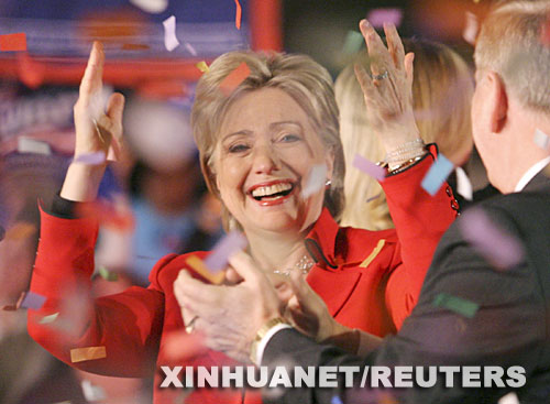 3月4日,在美国俄亥俄州首府哥伦布,来自纽约州的美国国会参议员希拉里与支持者庆祝预选胜利。新华社/路透