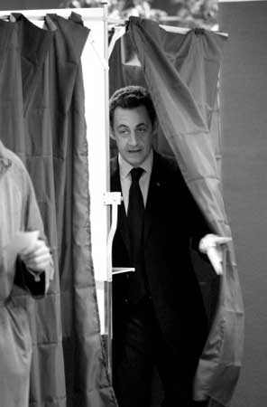 3月9日,萨科齐揭开投票站的帘子,准备投票。 王建芬 供图