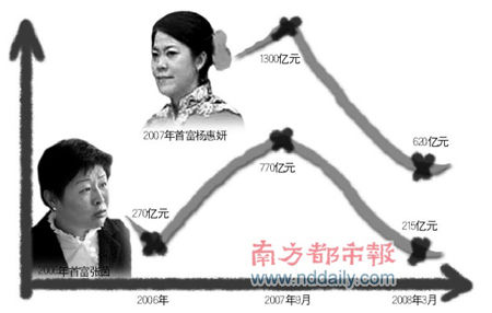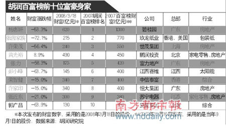 数据显示,前十位《2007胡润百富榜》富豪身家,采用的是2008年3月18日的股价数据,除黄光裕外,其余9位富豪的身家均有不同程度的缩水。其中杨惠妍的财富缩水超过50%,损失约680亿元,财富损失额最多;富力地产老板张力的财富缩水58%,损失约245亿元;上海地产大亨许荣茂的财富缩水56%,损失约310亿元;广州地产富豪许家印,由于旗下地产公司IPO推迟,以招股价下限3.5港元计算,财富缩水15%,损失约60亿元。