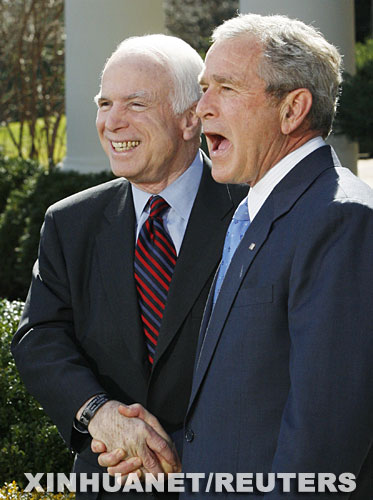 3月5日,美国总统、共和党人布什(右)和来自亚利桑那州的国会参议员麦凯恩在华盛顿白宫出席记者招待会。布什5日在白宫宣布,支持麦凯恩竞选下届总统,这标志着麦凯恩作为今年大选共和党总统候选人的地位得到了本党正式认可。新华社/路透