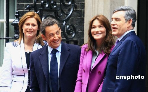 当地时间3月27日中午,正在英国进行国事访问的法国总统萨科奇携新婚妻子布鲁尼,与英国首相布朗在唐宁街10号会见。图为布朗夫妇在首相府外欢迎萨科奇夫妇。自右至左为布朗、布鲁尼、萨科奇、布朗夫人萨拉。