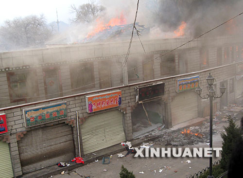 3月14日,拉萨市小昭寺附近的商店正在燃烧。