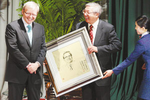 照片:4月9日,澳大利亚总理陆克文在北京大学用中文发表演讲,并回答了北大学生的提问。演讲后,北京大学校长许智宏向陆克文赠送了北大教师为他作的画像。记者赵青摄