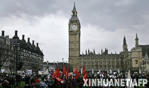 3月15日,抗议者在英国伦敦的国会大厦前集会。在伊拉克战争爆发5周年纪念日即将到来之际,英国民众15日举行大规模反战游行,要求英国政府从伊拉克和阿富汗撤军。 新华社/法新