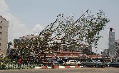 这是5月5日在缅甸最大城市仰光市中心拍摄的一棵被风刮倒的大树。据缅甸国家电视台5日报道,2日登陆缅甸的热带风暴已造成至少1.5万人死亡,随着救灾深入,死亡人数还可能继续上升。新华社/法新