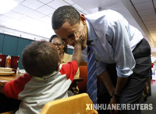5月5日,在美国北卡罗来纳州格林斯伯勒的一家饭店中,一名7个月大的婴儿触摸美国民主党总统竞选人奥巴马的脸。角逐美国民主党总统候选人的希拉里和奥巴马目前正在备战5月6日举行的印第安纳州和北卡罗来纳州预选。