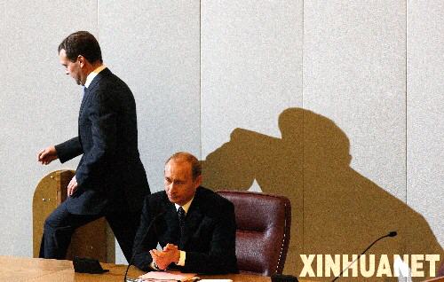 5月8日,在俄罗斯首都莫斯科,俄总统梅德韦杰夫(左)与前总统普京在国家杜马(议会下院)出席非例行全体会议。当日,俄杜马以392票赞成、56票反对和零票弃权的表决结果,批准了新总统梅德韦杰夫对普京出任新政府总理的提名。梅德韦杰夫已签署命令,任命普京为俄新一届政府总理。新华社记者沈伯韩摄