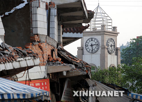 德阳市汉旺镇汉旺广场上的一座大钟将时间定格在地震发生的那一刻(2008年5月14日摄)。 新华社记者王建华摄