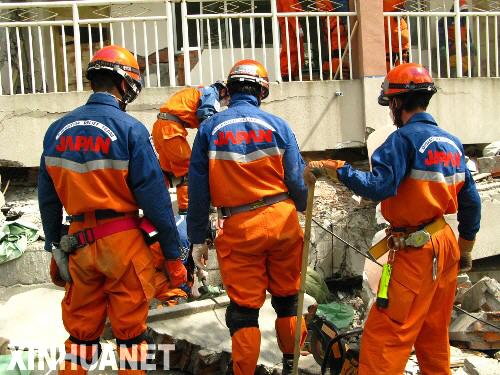 5月18日,日本救援人员在北川中学进行救援工作。 5月18日,日本救援人员继续在位于任家坪的北川中学救援,并于下午在两地均发现生命体征迹象。但随着连续十几个小时的艰苦搜救,生命迹象最终被证明并不存在,日方人员不得不放弃搜救,于19日全部前往北川县城曲山镇进行搜救。 新华社记者唐师曾摄