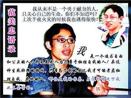 5月22日,四川都江堰光亚学校语文教师范美忠,在天涯论坛发表了《那一刻地动山摇—512汶川地震亲历记》一文。文中细致描述了他在地震后所做的一切及过后的心路历程。据其本人描述,地震发生的时候,他正在课室给学生上课,感觉到地震发生,他第一时间跑到了操场上。文中还写到“一个追求自由公正的人,却不是先人后己勇于牺牲自我的人!在这种生死抉择的瞬间他只有为了女儿才可能考虑牺牲”,并称自己在事后对当时“率先逃跑”没有感觉到丝毫的内疚。