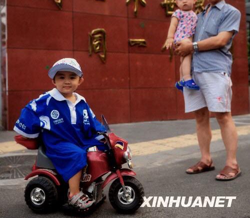 两岁半的小东东家住国家体育场——“鸟巢”边。天天看着许多志愿者哥哥姐姐,东东也吵着要当志愿者。8月6日傍晚,东东穿着妈妈的志愿者服装,骑着小电动摩托,神气地出现在小区里。 新华社记者王庆钦摄