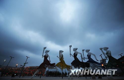 这是夜色中的北京奥林匹克公园的一处雕塑(8月11日摄)。夜幕降临,北京奥林匹克公园华灯初上,格外美丽。新华社记者 江宏景 摄