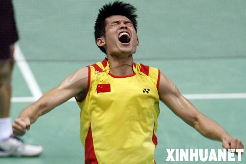 8月17日,中国选手林丹在庆祝胜利。当日,在北京奥运会羽毛球男子单打决赛中,中国选手林丹以2比0战胜马来西亚选手李宗伟,夺得金牌。 新华社记者张晨摄