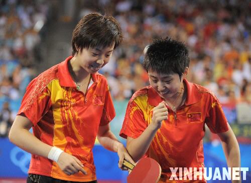 8月17日,中国队员张怡宁(左)/郭跃在比赛中。当日,中国队在北京奥运会乒乓球女子团体决赛中以3比0战胜新加坡队,夺得金牌。 新华社记者徐昱摄