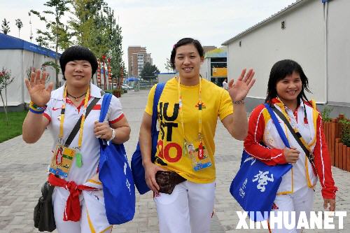 8月17日,中国举重选手刘春红、曹磊、陈燮霞(从左至右)微笑着走在北京奥运村商业文化街上。她们分别获得北京奥运会女子举重69公斤级冠军、75公斤级冠军和48公斤级冠军。 新华社记者张国俊摄 |