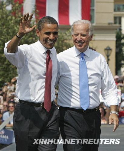 8月23日,在美国伊利诺伊州的斯普林菲尔德,美国民主党总统候选人、伊利诺伊州国会参议员奥巴马(左)与竞选伙伴拜登一起出席竞选集会。奥巴马当天宣布,他已选择特拉华州国会参议员、参议院对外关系委员会主席拜登为竞选伙伴。新华社/路透