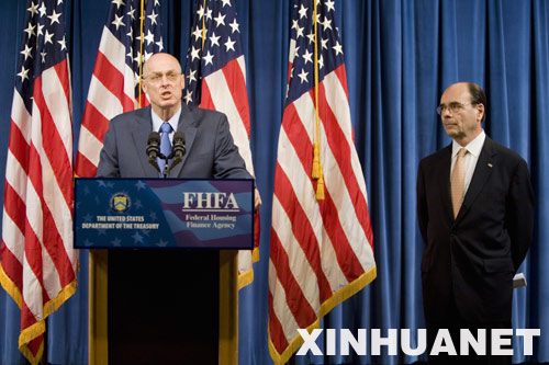 9月7日,美国财政部长保尔森(左)和联邦住房金融局局长詹姆斯·洛克哈特在新闻发布会上宣布,美国政府接管陷入困境的美国两大住房抵押贷款融资机构房利美和房地美。 新华社发