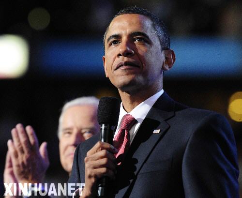 8月27日,获得美国民主党总统候选人提名的伊利诺伊州参议员奥巴马(右)在丹佛举行的美国民主党全国代表大会上发表讲话。当日,在丹佛举行的美国民主党代表大会上,奥巴马被正式提名为美国总统候选人,拜登被正式提名为美国副总统候选人。拜登于当日接受了这一提名,奥巴马将于8月28日正式接受美国总统候选人提名。 新华社记者张岩摄