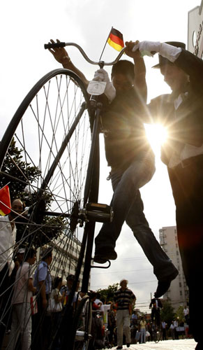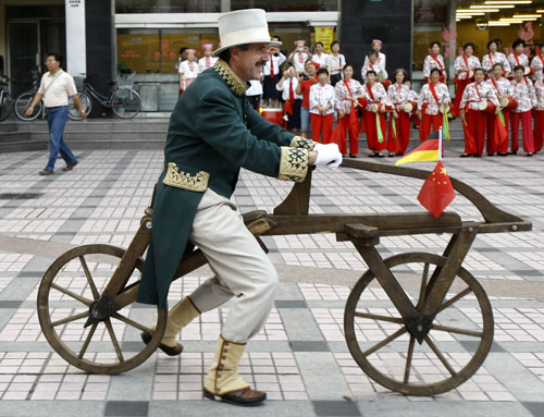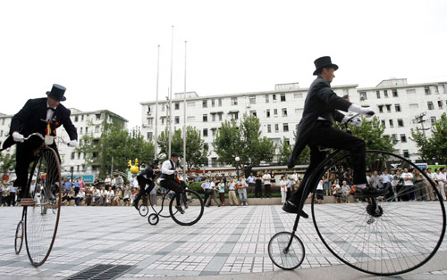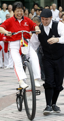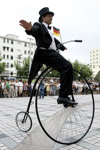 上海旅游节开幕之际,德国高轮自行车团的艺术家们骑着世界上最早的自行车——高轮自行车,来到了上海田林社区。居民在家门口感受了异域文化妙趣风采。此次走进田林社区是他们来华行程安排中唯一的一次社区表演。