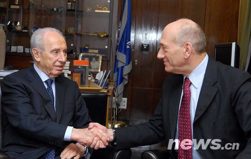 9月21日,以色列总理奥尔默特(右)向总统佩雷斯递交辞呈,正式辞去总理职务。新华社发
