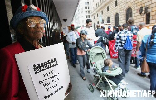 9月23日,一些抗议者在美国纽约联邦储备银行门外举行集会,要求联邦储备委员会在挽救金融市场的同时救助无力还贷的购房者。当天上午,美国财政部长保尔森、联邦储备委员会主席伯南克和美国证券交易委员会主席考克斯在国会作证,敦促国会议员尽快批准总额达7000亿美元的金融援救计划。 新华社/法新
