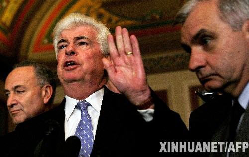 2008年9月26日 美国国会就大规模金融援助计划达成原则一致 9月25日,美国参议院银行委员会主席克里斯托弗·多德(中)在华盛顿国会山向媒体发表讲话。经过约3个小时的紧急磋商,美国国会当日就布什政府提出的7000亿美元大规模金融援助计划达成原则一致,这使该方案朝实施方向迈出了关键一步。但消息人士也透露,国会可能给救援方案添加了诸多限制条件,布什政府还在研究是否能接受修改后的方案。 新华社/法新