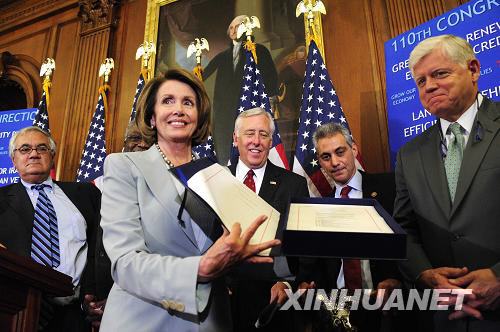 10月3日,美国国会众议院议长佩洛西(左二)展示已签署的金融救援方案。当日,美国国会众议院以263票对171票的投票结果通过了经过修改的大规模金融救援方案。该方案在众议院通过后,将交由总统布什签署生效。美国国会参议院已于1日通过这份总额达7000亿美元的救市方案。新华社记者张岩摄