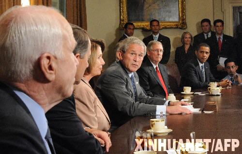 9月25日,美国总统布什(中)在白宫举行的商讨金融危机对策的会议上发表讲话。当天,白宫举行会议,商讨金融危机对策。美国总统布什、两党总统候选人以及国会两党重要议员参加。 新华社/法新