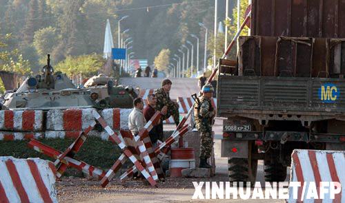 10月5日,在格鲁吉亚靠近阿布哈兹的一个村庄, 一辆军车从俄罗斯维和士兵守卫的哨卡旁驶过。俄罗斯维和人员当天开始拆除哥里镇附近一个军事观察哨,同时在“安全区”内多处驻地进行撤离前准备。根据法国总统尼古拉·萨科齐促成的一项停火协议,俄方同意在欧盟观察团履行职能后10天内撤出除南奥塞梯和阿布哈兹以外的地区。欧盟观察团负责监督协议落实情况、从俄军手中接管控制权等。 新华社/法新