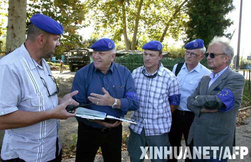 10月5日,在格鲁吉亚靠近阿布哈兹的一个村庄,欧盟观察团成员在交谈。新华社/法新
