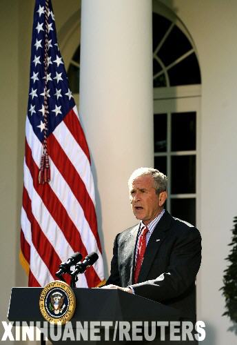 10月3日,美国总统布什在首都华盛顿就美国国会众议院通过经过修改的大规模金融救援方案发表讲话。当天,这份总额达7000亿美元的金融救援方案由布什签署生效。 新华社/路透